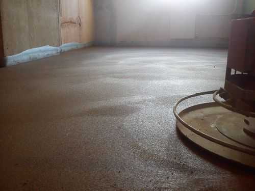 - Процесс подачи раствора к месту будущего пола не должен прерываться. Но это качество помогает лечь раствору равномерно по всей поверхности, практически без изъянов.