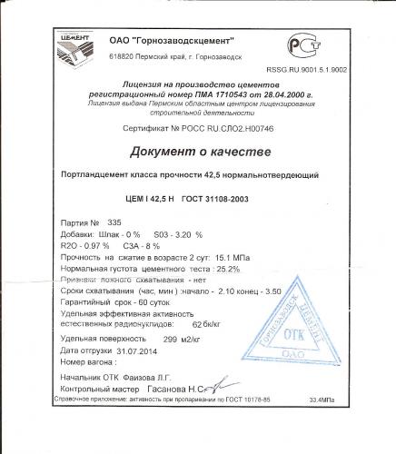 Данный документ свидетельствует о соответствии товаров требованиям актуальных стандартов (параметры качества сухой смеси на цементном вяжущем закреплены в ГОСТ 31357-2007).