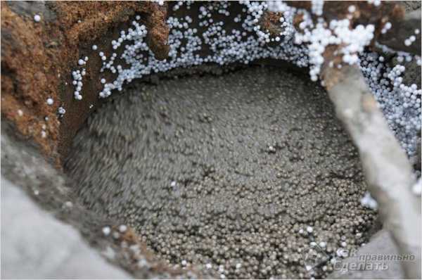 - Состав полистиролбетона Далее засыпается 3 ведра гранул вспененного полистирола. Это половина необходимого количества. Засыпается эта часть сейчас, чтобы уменьшить количество цемента, который может прилипнуть к стенкам.