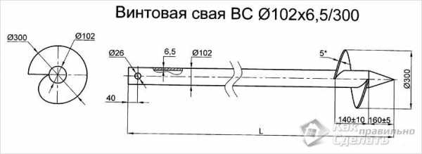 Чертеж винтовой сваи Диаметр винта — это также индивидуальная составляющая. Его размер будет зависеть от того, на какую глубину планируется погружение, а также определяющим будет состав грунта. Чем больше длина сваи, тем меньше будет винт. Дело в том, что чем слои будут плотнее, тем сложнее ее будет вкручивать. Для его изготовления можно приобрести заготовки. Если есть желание сделать своими руками, тогда понадобится листовой металл в 5 мм. Можно использовать диски с тракторной навески. По образцу вырезаются элементы. Они представляют собой полукруги с выбранной в середине частью, которая равна диаметру трубы. Разогнуть их нужно таким образом, чтобы получился шаг в 5 см. Они привариваются к стойке.- В верхней части сваи необходимо изготовить поперечное отверстие, предназначенное для рычага, который позволит производить проворачивание.