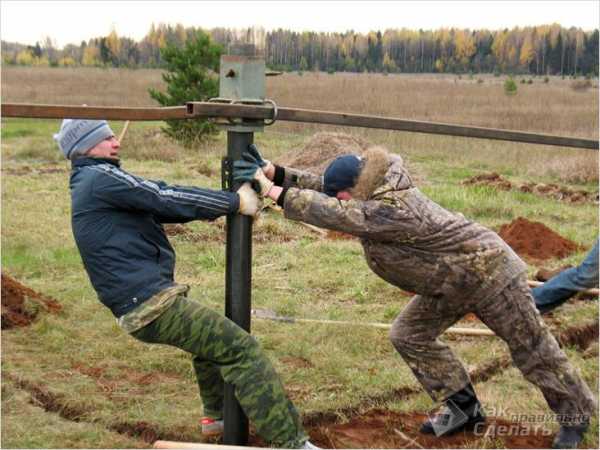 Закручивание сваи По отмеченным точкам вкручиваются сваи. Важно следить, чтобы элементы располагались строго вертикально. Добиться этого можно несколькими пузырьковыми строительными уровнями. Если у них есть магнитная основа, тогда они просто крепятся вертикально на трубу, в другом случае их можно примотать при помощи скотча или изоленты.- Заранее на каждом столбике можно нанести метку, до которой необходимо осуществлять погружение.