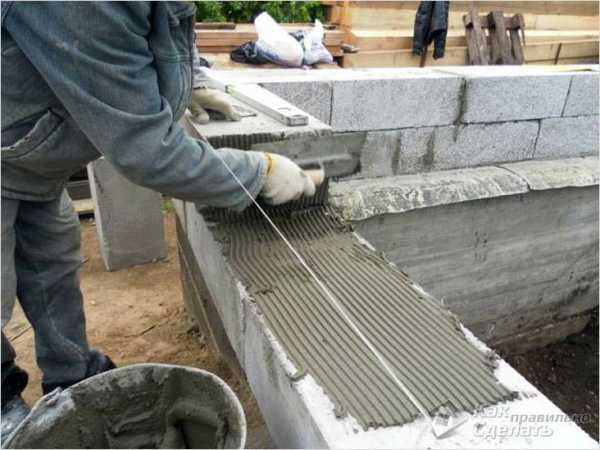- Первый блок выставляется при помощи пузырькового или лазерного уровня во всех плоскостях. Слой раствора для этого ряда может составлять до 3 см.