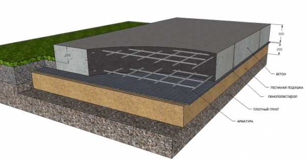 Монолитная плита изготавливается с применением сплошного армирования. Ее толщина зависит от планируемого здания, и колеблется от 25 до 55 см. Применение мелкозаглубленного варианта плиты дает экономию материалов до 35-40%.