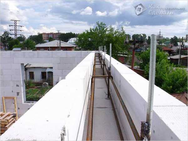 Во время кладки обязательно нужно выполнять обвязку с помощью арматурной сетки. Как правило, арматура выкладывается через каждые три ряда газобетонных блоков, а также под оконными и дверными проемами. В последних рядах в области стропильной системы необходимо предусмотреть армированную кольцевую балку.