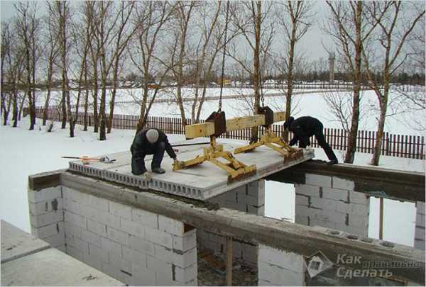На последний ряд кладки укладываются бетонные плиты или другое перекрытие. Если план предусматривает несколько этажей, кладка последующих этажей будет опираться на плиты перекрытия.
