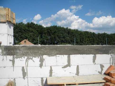 Необходим армопояс, предотвращающий срез материала. Армирование производится обычной кирпичной кладкой прямо поверх блока – это для небольших и не слишком тяжелых домов. В случае с просторным коттеджем армопояс нужно выкладывать по-настоящему, с арматурными прутьями. Достаточно двух кирпичей в высоту.