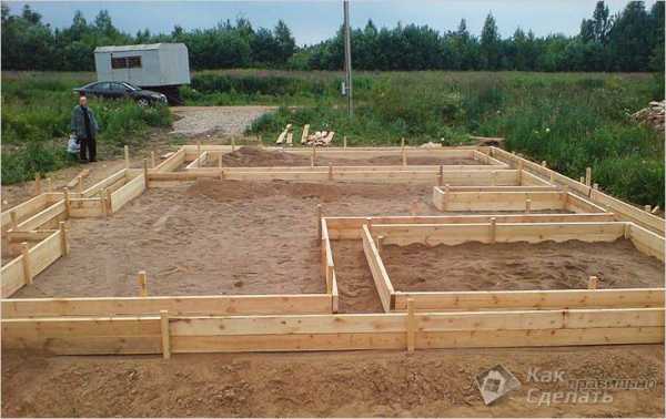 - теперь сделайте разметку. Для этого, отталкиваясь от чертежей, забейте колья по углам здания. Следует отметить, что ленточный фундамент возводится под каждую стену, повторяя контур здания. Именно это вам нужно сделать на земле. По этой разметке вы будете рыть траншею, поэтому все нужно делать ровно, соблюдая размеры и ширину фундамента;