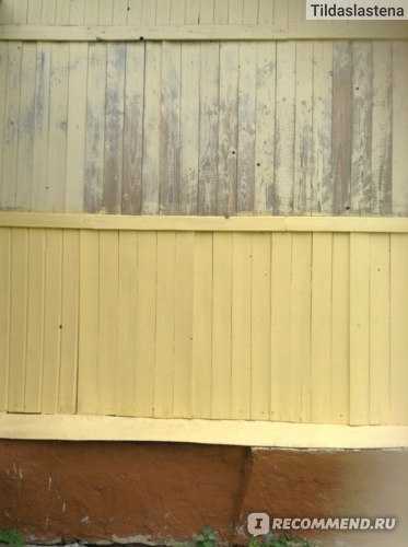 Мы красили дом, который уже ранее обрабатывался разными видами красок, и не раз. Поэтому полностью очистить поверхность, естественно, не удалось. Грунтовку тоже не использовали, потому что дерево старое, и без того все шершавое. Краску наносили в два слоя. Первый слой сильно разбавляли водой, второй чуть меньше, но все равно пришлось разбавлять, т. к. сама краска очень густая и без воды плохо ложится.