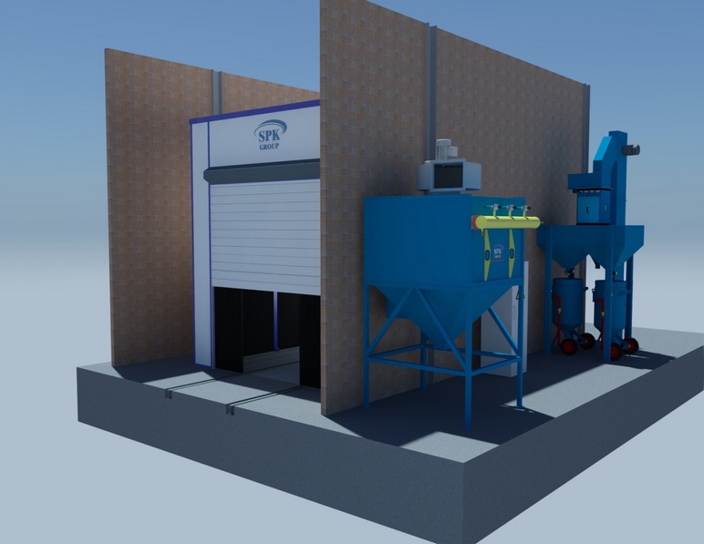 Для создания воздухообмена в дробеструйной камере предлагается изготовить систему напорных воздуховодов, в которые интегрируется аспирационная установка. Верхний пленум изготавливается с системой клапанов и воздуховодов для летнего и зимнего режимов, два диагональных нижних воздухоприемника устанавливаются либо в торцевой стене при тупиковом расположении, либо по сторонам у выездных ворот. Для всех дробеструйных камер предусматривается система рециркуляции с возможностью подмешивания свежего воздуха в объеме 10 – 15%.