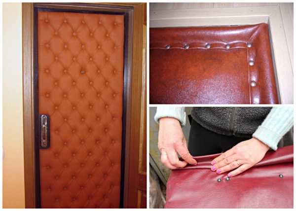 Всю площадь двери оклейте поролоном, который для большей долговечности можно сделать двухслойным, или покрыть поролон двумя ватиновыми слоями. Поверх поролона накладывается дерматин, либо другое декоративное покрытие, которое крепится к площади двери при помощи декоративных мебельных гвоздей. Пробивать декоративное покрытие следует от центра, сначала закрепляя верхнюю часть, и только после этого нижнюю. Следует особенное внимание при креплении дерматина или любого другого материала, чтобы не образовывалось перекосов и бугров. Для украшения входной двери можно использовать декоративную струну или леску, которую крепят между гвоздями.