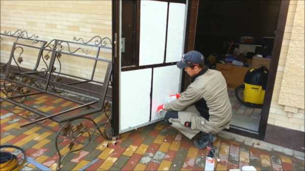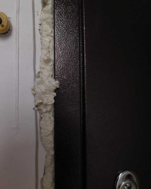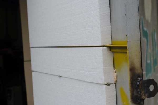 - Затем запенивают все щели и стыки между утеплителем и профилем, а также между составными кусками пенопласта, использованными в целях экономии при утеплении ячейки с дверным замком.
