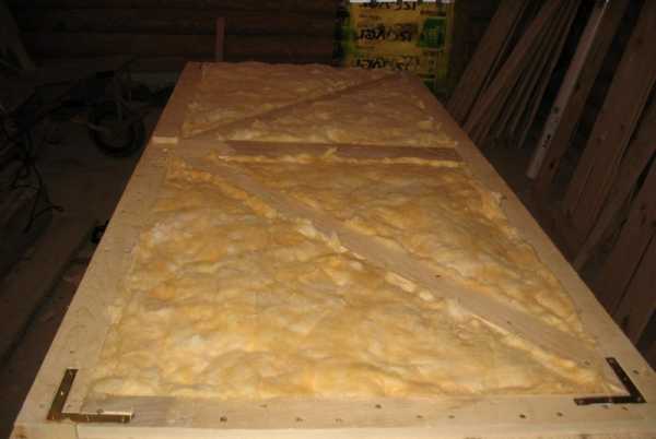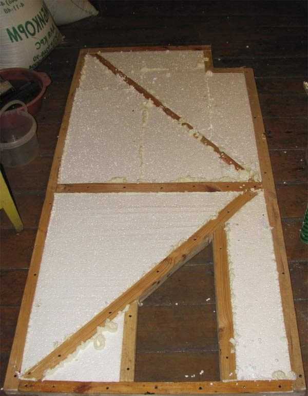 Далее приклеиваем деревянные реечки по кругу дверного полотна и вдоль поперечных ребер, либо прикручиваем на саморезы, рейки не должны выступать за полотно. Между сделанным нами только что каркасом улаживаем утеплитель, если пенопласт, вырезаем четко по размеру, чтобы не было больших щелей, если другой утеплитель следим чтобы он лег вплотную к реечке.