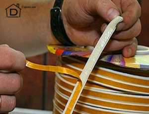 Приклеивается просто, нужно отмерить необходимую длину, отстричь, с одной стороны оторвать немного бумаги и липкой стороной приклеить на коробку, далее лента выравнивается, и постепенно убираем бумагу и приклеиваем по кругу дверной коробки.