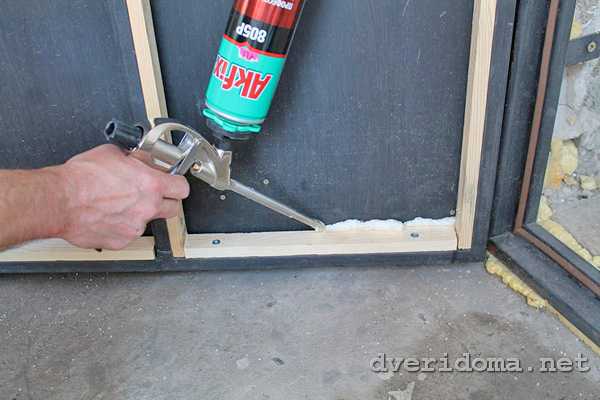 Далее приступаем к утеплению, для удобства можно снять входное полотно с петель и положить на ровную поверхность, снять фурнитуру и старый утеплитель, если имеется. По всему периметру прибиваем реечки шириной как пенопласт, внутрь получившегося каркаса будем вкладывать пенопласт, либо любой другой утеплительный материал, но сначала для лучшего крепления нанесем жидкие гвозди.