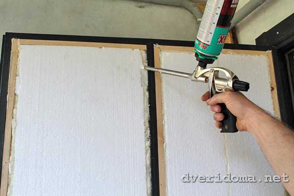 Далее приступают к укладке нарезанных кусков пенопласта в полости «скелета» двери. Для надежного крепления теплоизоляционного материала к листу железа используют монтажную пену.