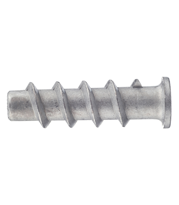 Это распорный усиленный дюбель, применяется при технических условиях с повышенными нагрузками. Используют этот крепежный элемент в полнотелых материалах, такие как кирпич, камень, бетон. При вкручивании в него крепежа, расширение его диаметра происходит по всей длине, при этом шипы в начале изделия прочно удерживают его в отверстии, не давая провернуться.
