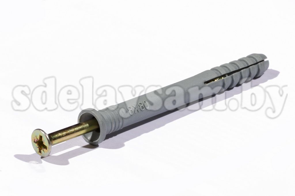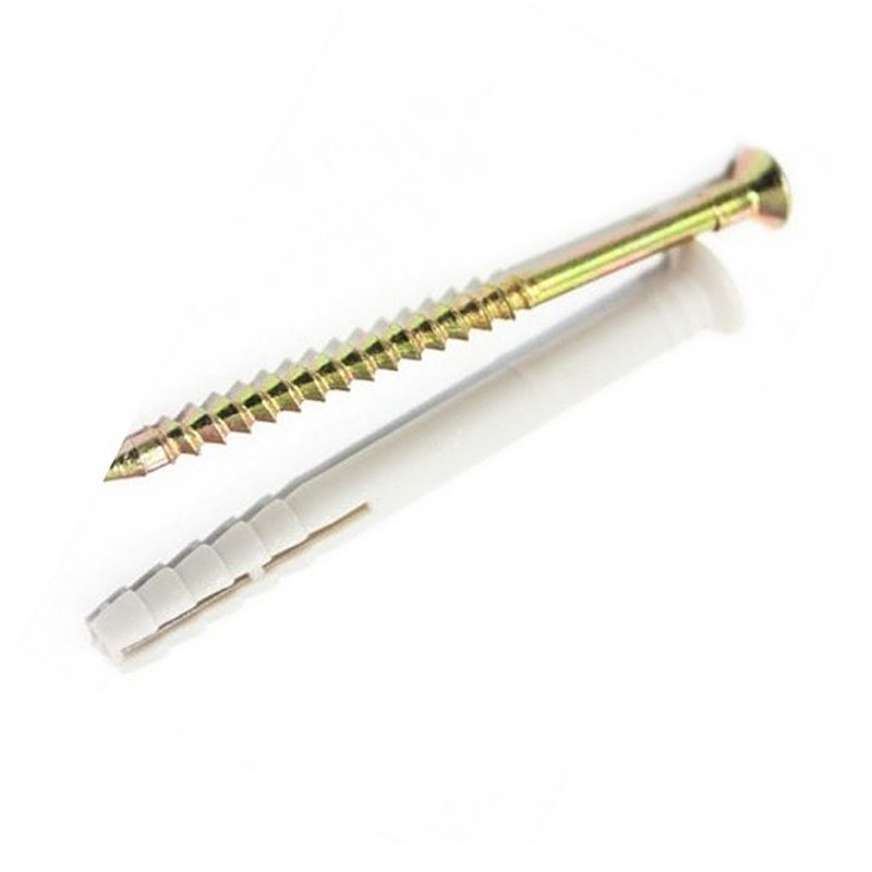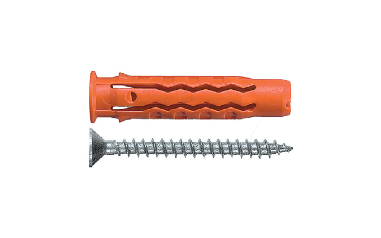 Такая конструкция представляет собой пластмассовую втулку с насечками по всей длине и усиками, а также вставляемый в нее специальный стержень, который гарантирует прочность и надежность крепежа.