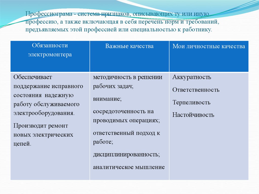Профессия инженер-электрик подходит для людей с хорошей памятью и наличием логического мышления. Обусловлено это тем, что такая специальность требует обязательного обучения безопасности труда, а также изучения норм и законов, которые непосредственно относятся к данной сфере деятельности.