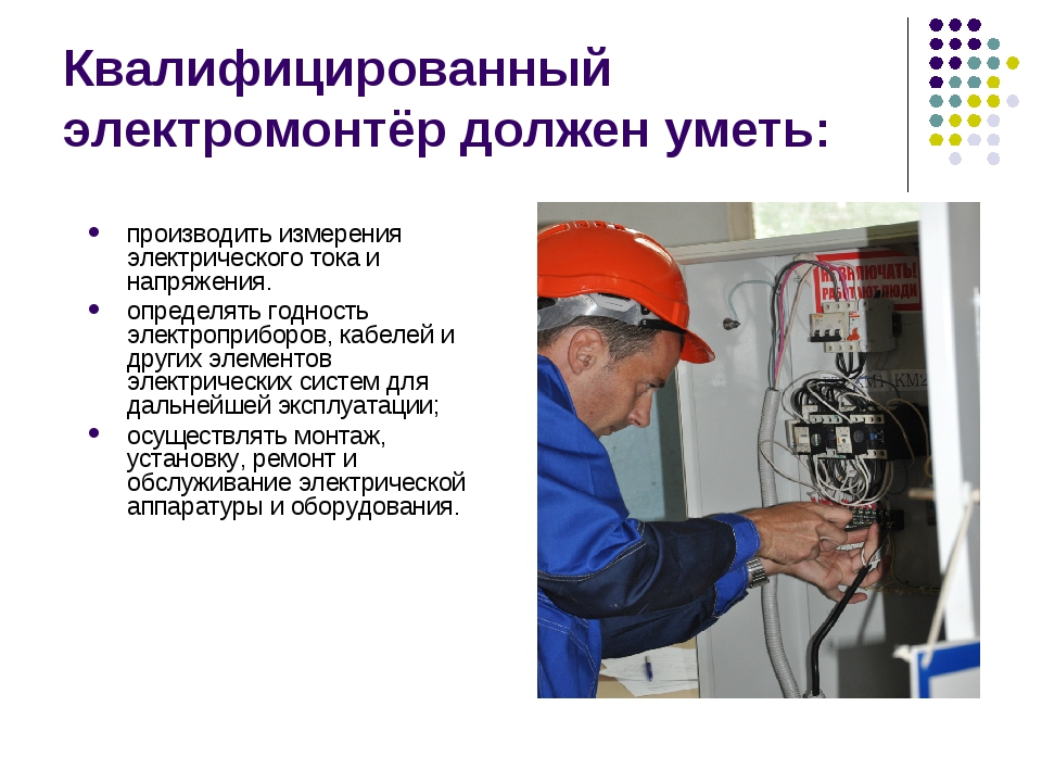 Электрики требуются на больших и малых предприятиях, для обслуживания частных домов. Инженеры должны соответствовать следующим требованиям: