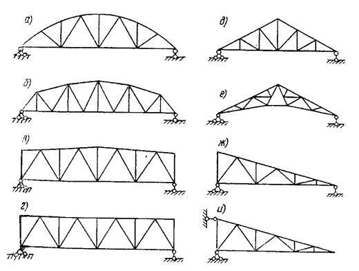 Очертание верхнего пояса близко к кривой давления от нагрузки, равномерно распределенной по всему пролету, и усилия в решетке сравнительно малы. Следует стремиться использовать минимальное число панелей и принимать длину панелей верхнего пояса не менее 6 м.