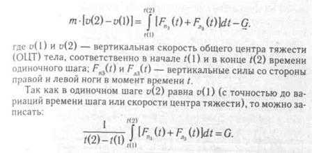 Из этой зависимости могут быть выведены, в частности, некоторые общие свойства вертикальной силы при локомоциях. После однократного интегрирования по времени одиночного шага получим уравнение для проекции импульсов сил на гравитационную вертикаль: