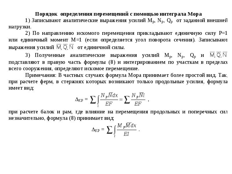 Обозначая буквой Δ любое перемещение (линейное или угловое), формулу (интеграл) Мора напишем в виде