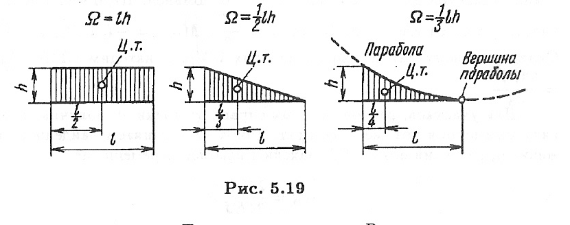 Очевидно, что разнообразие приложенных нагрузок и геометрических схем конструкций приводит к различным, с точки зрения геометрии, перемножаемым эпюрам. Для реализации правила Верещагина нужно знать площади геометрических фигур и координаты их центров тяжести. На рис.29 представлены некоторые основные варианты, возникающие в практических расчетах.