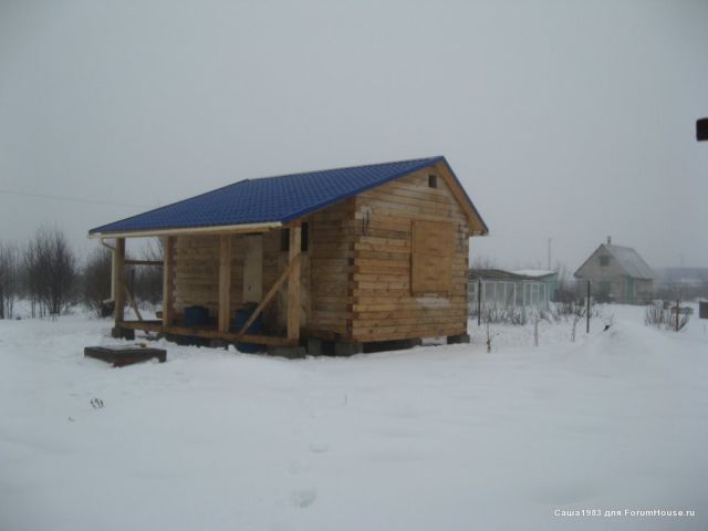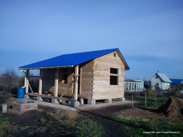 Как можно видеть на фото, баня, которая установлена на данный фундамент имеет небольшие габариты и построена из бруса. Коробка из брёвен или бруса гарантирует более равномерное распределение нагрузки на каждую опору, чем каркасная конструкция, имеющая менее жесткую структуру.