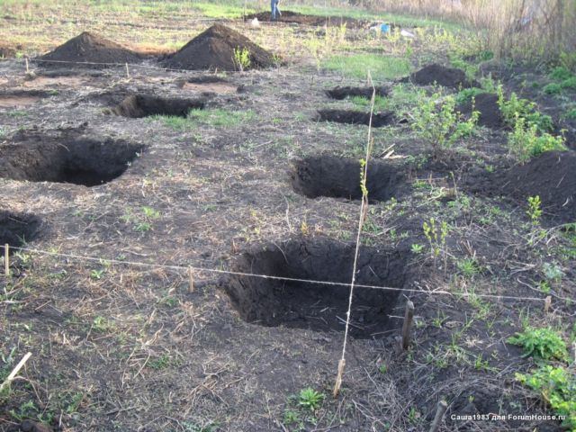 После проведения всех замеров, установки колышков и натяжки нитей можно приступать к выкапыванию ям. Глубина выбирается с ориентацией на высоту плодородного слоя, но не менее 25 см. Нужно полностью снять верхний слой грунта и добраться до лежащей под ним более плотной прослойки почвы.