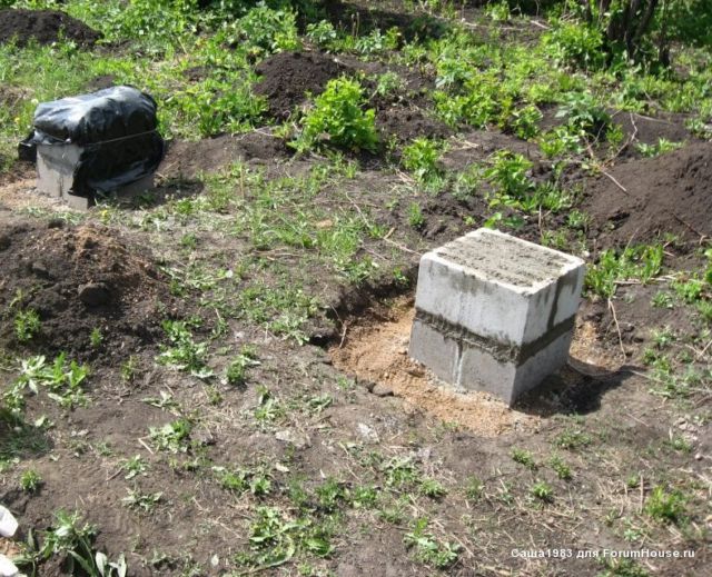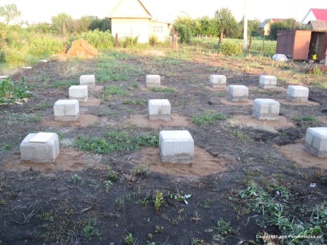 Вес постройки будет определять количество требуемых столбиков, которые обеспечат сохранение стабильно устойчивого положения здания. Выбор простого столбчатого фундамента под баню из столбиков, собранных на основе фундаментных блоков, допускается только в том случае, когда общий вес конструкции небольшой (лёгкий материал стен и отсутствие второго этажа).