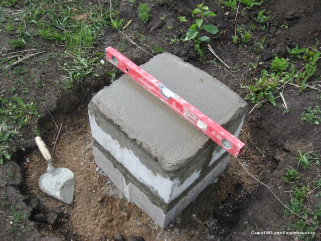 Далее каждая яма засыпается слоем песчано-гравийной смеси (ПГС) или песка высотой 15 см. Полученная поверхность проливается водой и хорошо утрамбовывается. Когда все ямки подготовлены, можно переходить к изготовлению столбиков. Одна опора состоит из четырех бетонных блоков 200х200х400 мм.