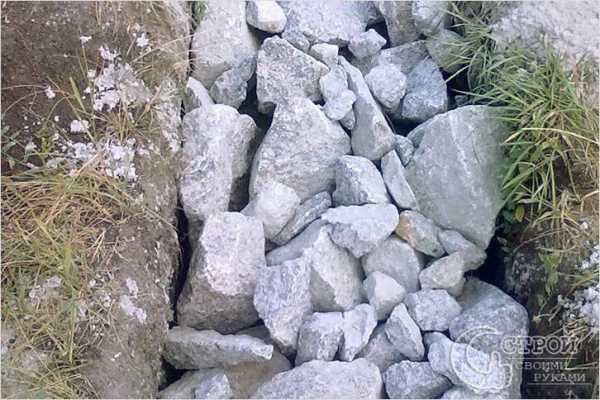 - Пустое пространство в основании засыпается щебнем из такого же осколочного камня и только затем заливается бетонный раствор.