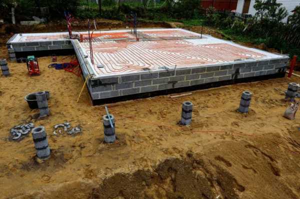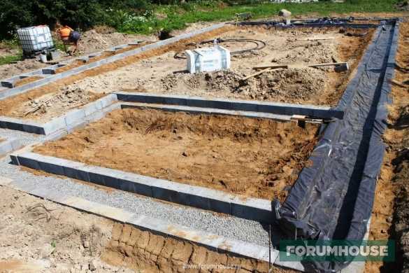 Фундамент утепляется изнутри экструзионным пенополистиролом , после чего периметр засыпается песком, песок утрамбовывается, прокладываются все необходимые инженерные коммуникации. Затем заливается бетонная стяжка с трубами, как вариант, тёплого пола.
