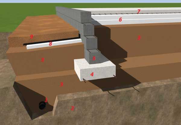 5 — Вертикальная часть фундамента, обычно из керамзитобетонных или цементнопесчаных блоков, общей высотой около метра.
