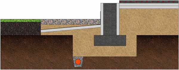 Дренаж будет размещаться по периметру ленты на уровне нижней части, для его монтажа расширять котлован не понадобится. Но понадобится углубить дно ямы на 50 см. Процесс дренирования выглядит следующим образом: