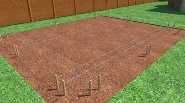 - Разметка выполняется с помощью специальных колышков. Между ними натягивается лента или шнур.