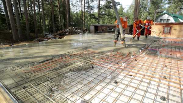 При толщине плит в 10-15 см и отсутствии больших нагрузок на конструкцию, будет достаточно одного армирующего пояса. Так как лента основания представляет собой решетку, конструкция предусматривает несколько отдельных стяжек в разных помещениях. Так что заливку за один раз можно будет произвести без особых проблем. Процедура бетонирования следующая: