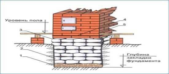 - с помощью красного обожженного кирпича делают кладку нескольких рядов, тем самым выводят основание фундамента до уровня чистого пола.