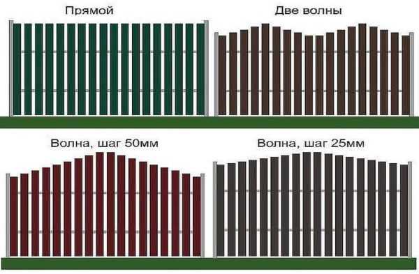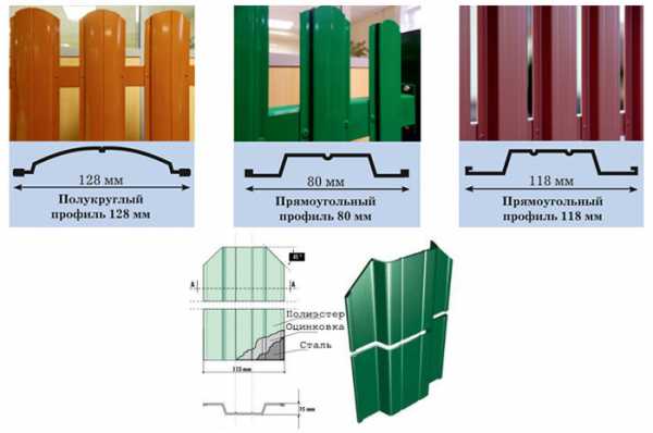 Виды металлического штакетникаДля столбов подойдут профилированные трубы (6×6 см). Толщина стенок не должна быть меньше 2 мм. К поперечным перекладинам предъявляют не слишком жесткие требования. Сечение — 4×2 см. Толщина стенок —1,5 мм (минимум).