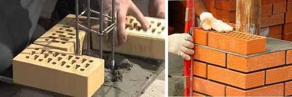 В любом случае, внутри сваи должно быть армирование. Это конструкция из 4-х прутков арматуры 8 мм, связанная поперечинами из 4-6 мм прутка. Она идет на всю глубину сваи, с выпуском в столб. Дальше, по желанию, можно арматуру нарастить, а промежуток между кирпичами в столбе залить бетоном. Второй вариант — к арматуре крепится труба, вокруг которой кладется столбик. В последнее время это более распространенный способ устройства кирпичного столба.