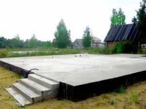 - Далее, устанавливается опалубка, куда укладываются пруты, и заливается бетонным раствором. После полного высыхания бетона опалубка снимается, основание готово.