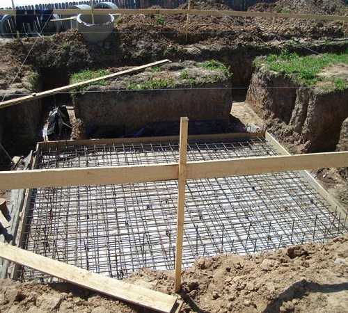 Для укрепления досок опалубки используйте дополнительные брусья, так как под весом бетона она может разрушиться. Далее следует установка арматурного каркаса во внутрь опалубки. Он сделает основание фундамента более прочным и стойким к высокой нагрузке. Диаметр арматуры определяется глубиной фундаментом и нагрузкой от всего здания. Арматурной сеткой покрывается арматура после ее установки, она также выполняет функцию дополнительного укрепления основания дома.