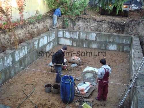 Эту «подушку» заливают слоем бетона толщиной 4-5 см. После чего настилается гидроизоляция (чаще всего используют рубероид или гидроизоляционная пленка) и снова заливается бетонный слой той же толщины. После чего укладывают арматуру, и и можно сделать теплоизоляционный слой. Затем снова заливается бетон толщина слоя которого должна быть 20-25 см.