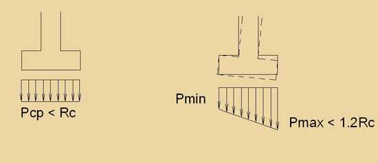 3) Третье явление – разрушение грунта под подошвой фундамента. Разберемся с ним. Вернемся к началу статьи, где мы писали, что давление под подошвой принимается меньше 15 т/м2 (1,5 кг/см2). При вертикальном действии нагрузки давление под подошвой распределяется приблизительно равномерно, причем оно не должно превышать Rc.