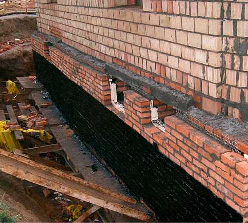 - Очень важным этапом работ является гидроизоляция стенок фундамента. Для данной работы можно использовать битумный раствор или рубероид. Также можно воспользоваться современными технологиями, при помощи которых гидроизоляционный материал наносится под давлением.