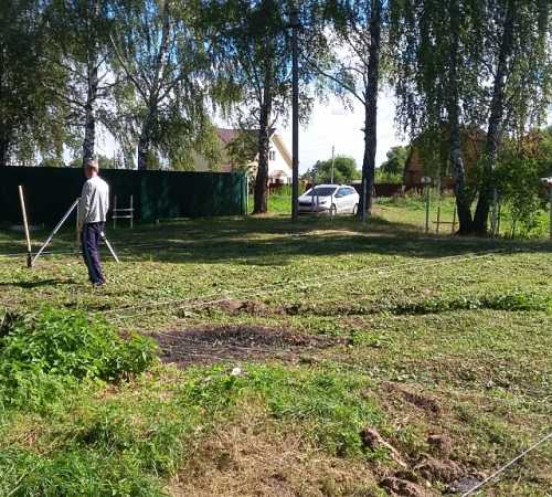 В зависимости от плана участка, выберите место, на котором будет расположен дом, и установите колышки. Проверьте, ровность установки каната с помощью строительного уровня. Если в процессе работы определяется асимметрия, разметка выполняется заново.