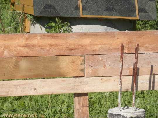 С внешней стороны две доски сороковки шириной 150 и еще две шириной 100, т.е. высота ростверка 50см. С внутренней стороны использовалась доска тридцатка шириной 100, т.е. по высоте ростверка пять досок. Тридцатку брали с целью экономии. Она еще и низкосортная была. С расчетом, что если разопрет внутри, то будет не видно и особо не навредит.
