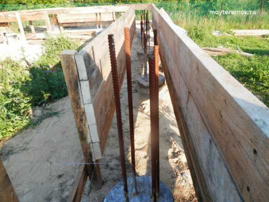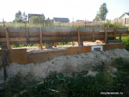 Мы не использовали классическую технологию с предварительной сборкой щитов, т.к. хотели поменьше пилить доски и еще почему–то. Сверху вниз от отмеченного на брусках уровня привинчивались на черные саморезы 55–65мм доски опалубки. Доски под бетон прикручивались с внутренней стороны брусков, а под подсыпку оставшегося зазора в 20см прибивались на гвозди 70 с внешней, см. фотки.