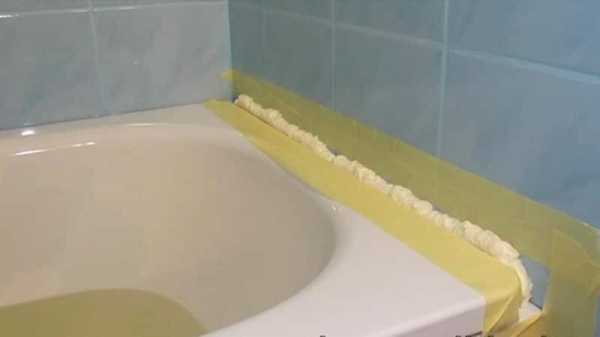 - Наклеить малярную ленту на место стыка на стене и на ванной, чтобы позже не пришлось очищать эти поверхности от высохшей пены;