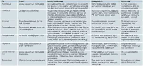 В таблице показаны основные виды герметиков, их технические характеристики и область их применения.